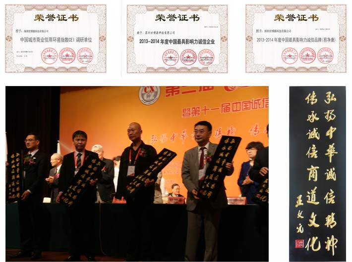 在本次企業(yè)家大會中,我公司榮獲了“2013-2014年度中國最具影響力誠信企業(yè)”、“2013-2014年度中國最具影響力誠信品牌(易凈康)”和“中國城市商業(yè)信用環(huán)境指數(shù)CEI調(diào)研單位”多項獎項以及王文元主席題名“弘揚中華誠信精神,傳承誠信商道文化”牌匾。