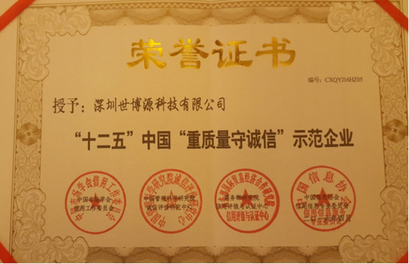 深圳世博源科技有限公司榮獲“十二五”中國(guó)“重質(zhì)量守誠(chéng)信”示范企業(yè)