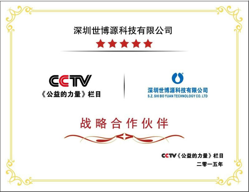 2015年1月,深圳世博源科技有限公司與中央電視臺《公益的力量》欄目正式簽署了戰(zhàn)略合作備忘錄,宣布雙方將建立戰(zhàn)略合作伙伴關系。我們將充分發(fā) 揮各自獨特的平臺和資源優(yōu)勢,以科技惠民,注重全民健康,弘揚社會責任,監(jiān)督公益進程,共同見證科技的力量、公益的力量