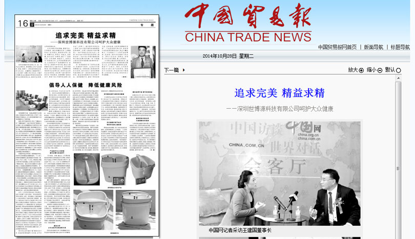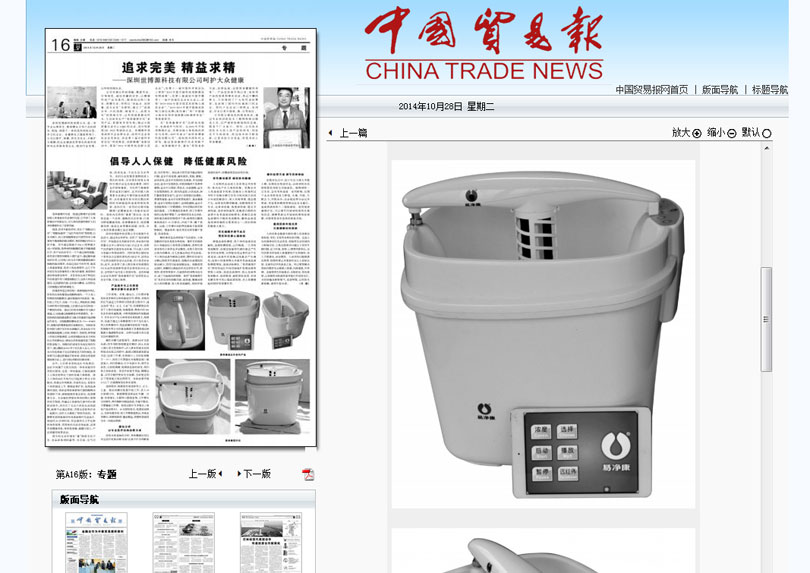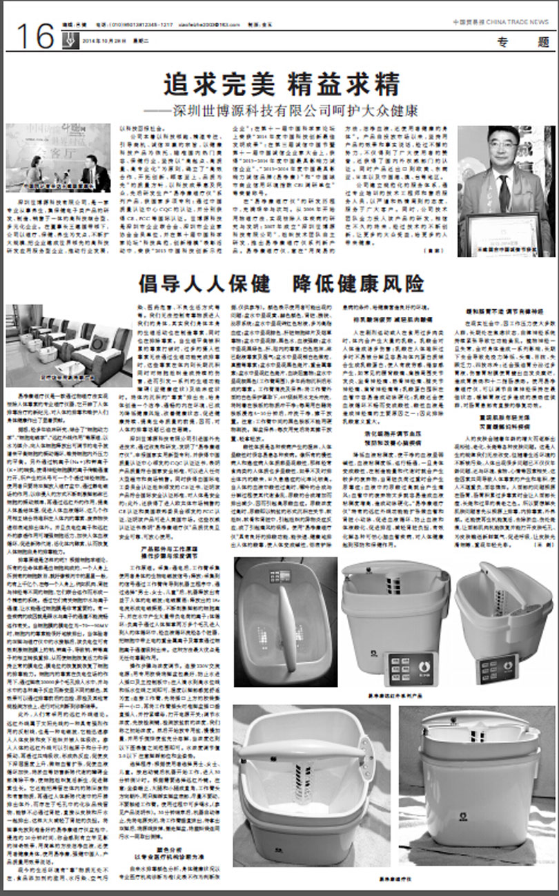 《中國貿(mào)易報(bào)》2014年10月28日第A16版:專題整版報(bào)道了“易凈康理療儀”,標(biāo)題為“追求完美,精益求精——深圳世博源科技有限公司呵護(hù)大眾健康”;“倡導(dǎo)人人保健,降低健康風(fēng)險(xiǎn)”。
